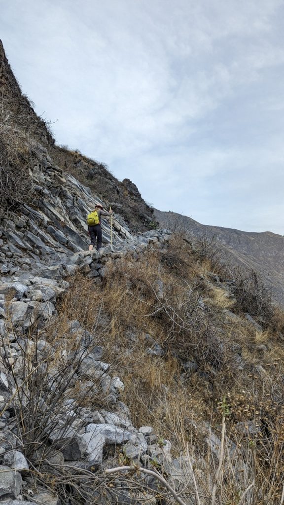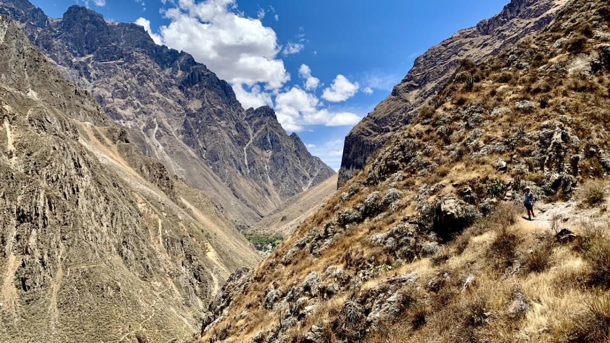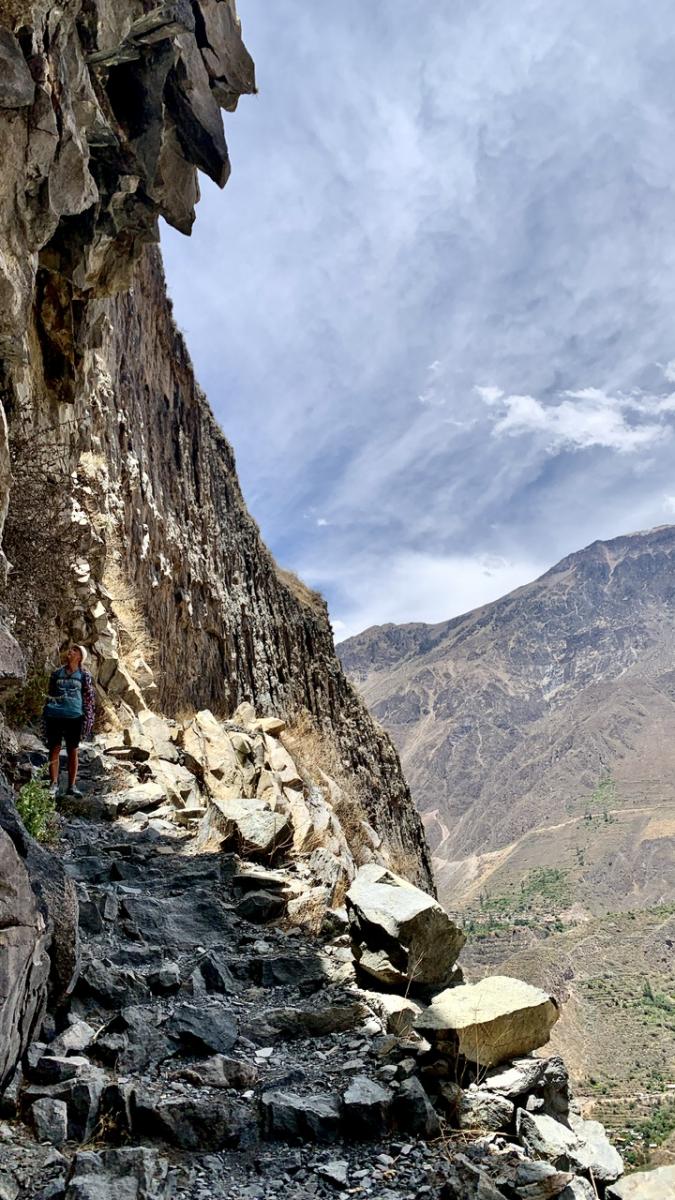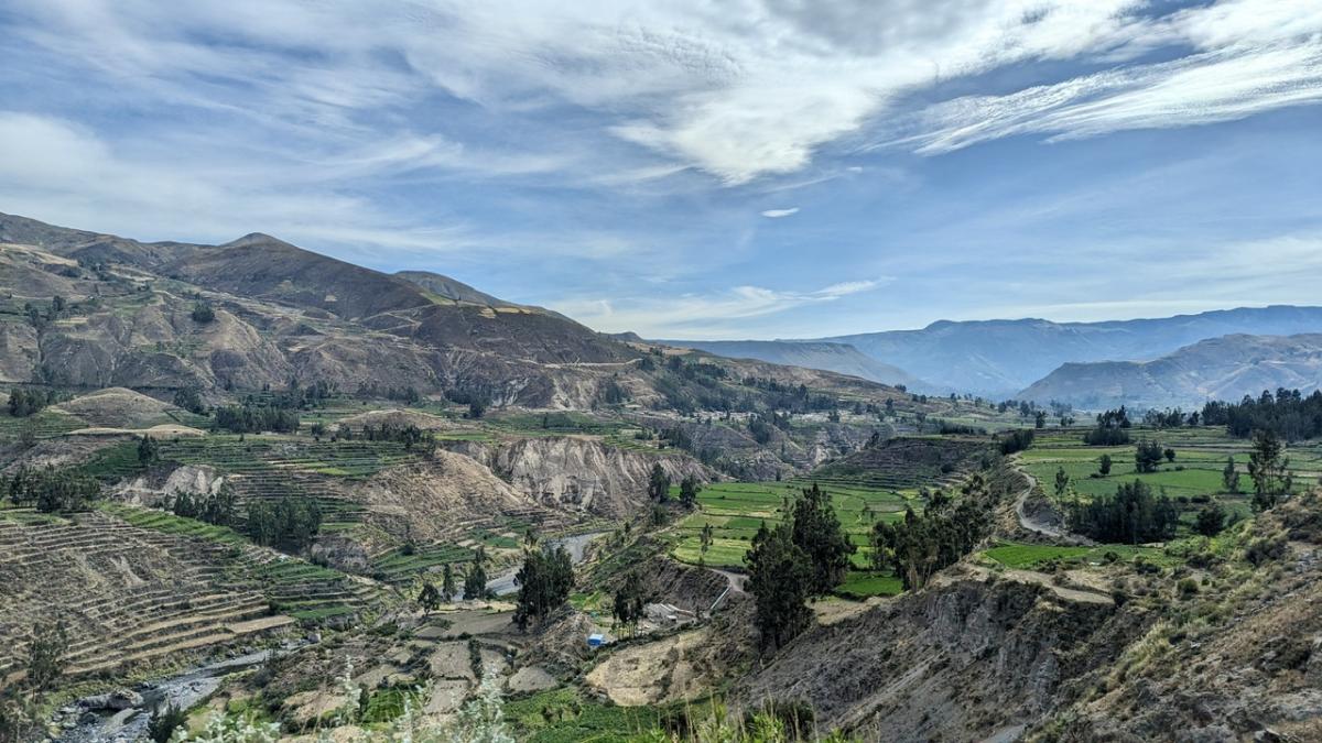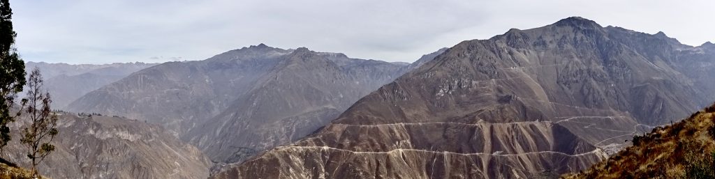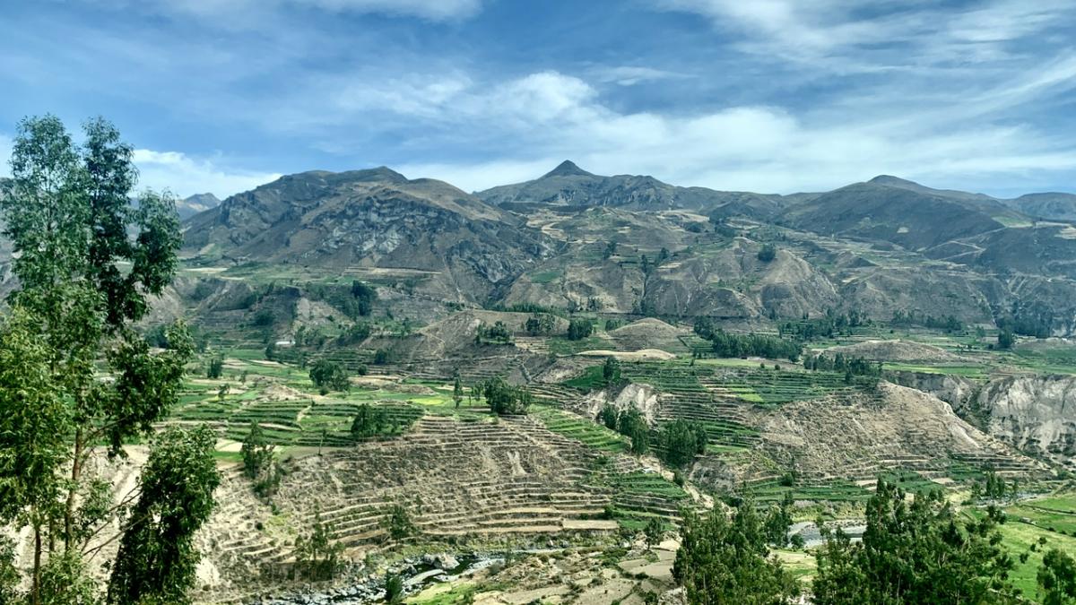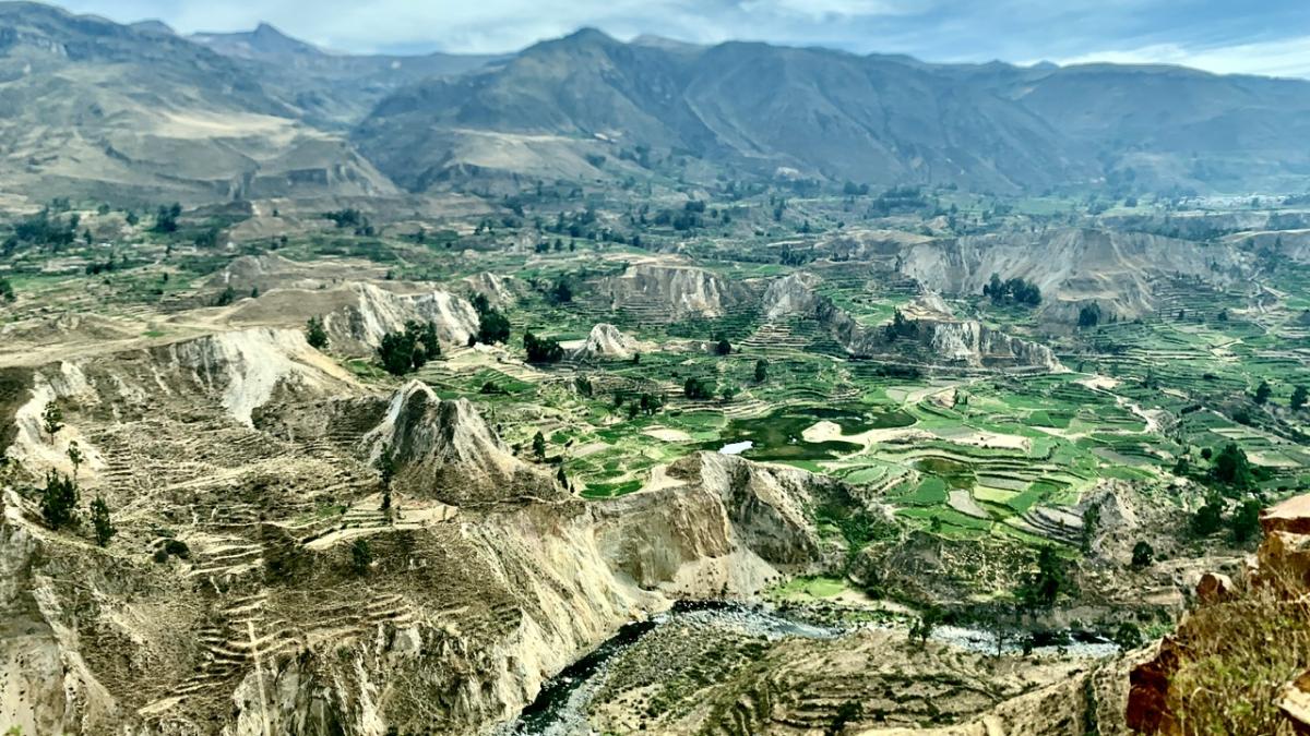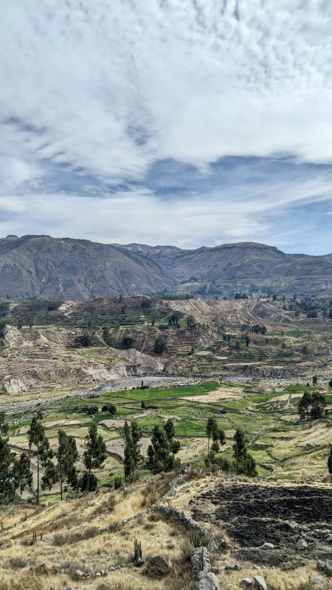 Schon die Fahrt hin zum Canyon ist der Wahnsinn!!! Das Panorama der Anden ist gigantisch. Zum ersten Mal sehen wir die berühmten Terrassen, die die Inka Völker hier in die Felsen gearbeitet haben, und denen das Gebirge seinen Namen verdankt: Anden geht auf das spanische Wort andenes (kurz andes) zurück – Feldterrassen. Außerdem ersetzen Steinmäuerchen die Zäune für Weiden, Felder und Beete und fügen sich ideal ins Landschaftsbild ein. Im Vorbeifahren sehen wir Kuhbauern auf den Feldern und ältere Damen in traditioneller Robe mit Körben auf der Straße.