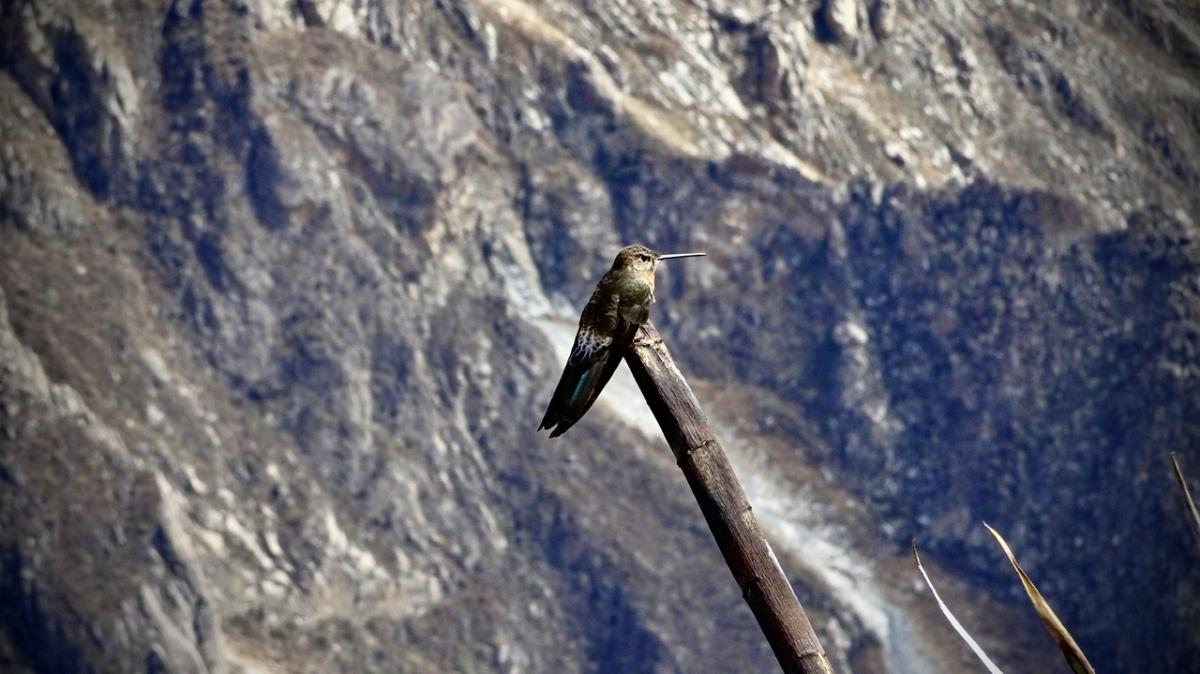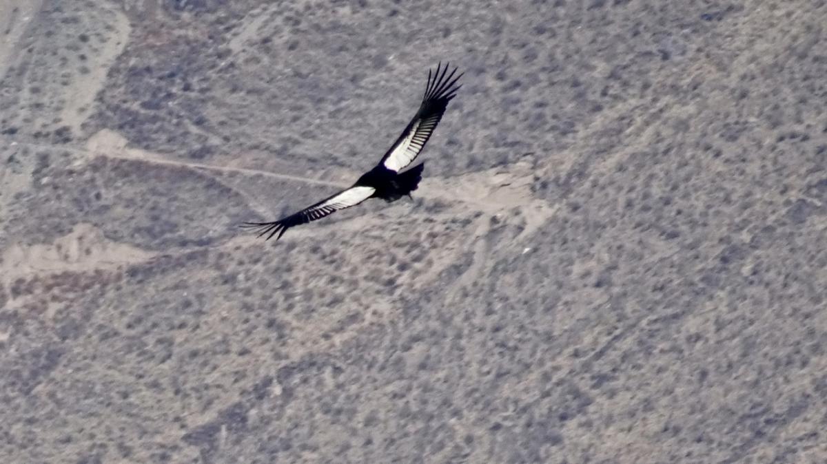 Am ersten Stopp, dem Cruz del Condor, haben wir Glück und erblicken zum ersten Mal den Anden Kondor, wie er in hohen Lüften gleitet.
