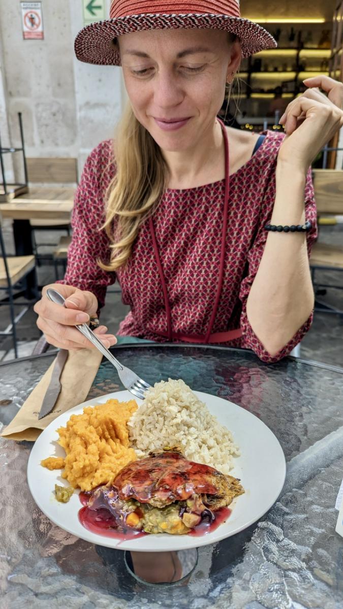 Bei einer kleinen Tour durch die Stadt sehen wir auch ganz nah die ersten Alpakas, die liebevoll Alpaquitas genannt werden. Wie schon in Lima tun wir uns leicht, was leckeres, gesundes, vegetarisches zum Essen zu finden. Schön 🙃