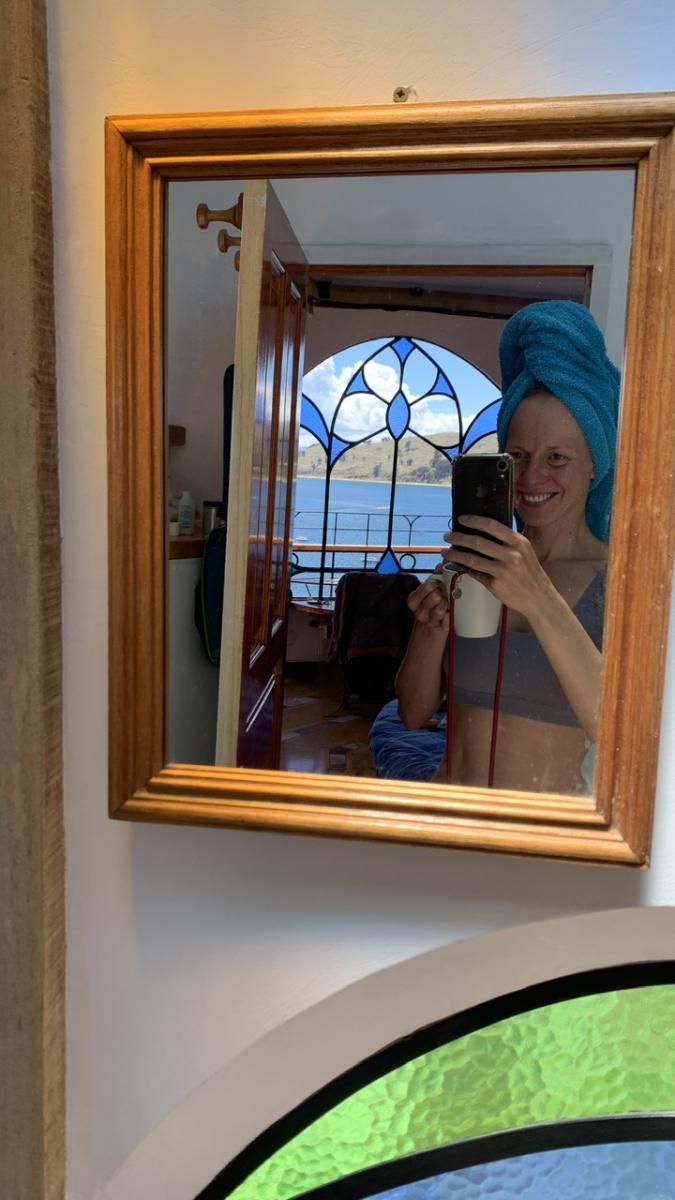 Wir sind völlig hin weg und können uns vor allem an der Aussicht die ersten Tage gar nicht sattsehen. Im Spiegel sieht man sogar beim Zähneputzen den von der Sonne glitzernden See.