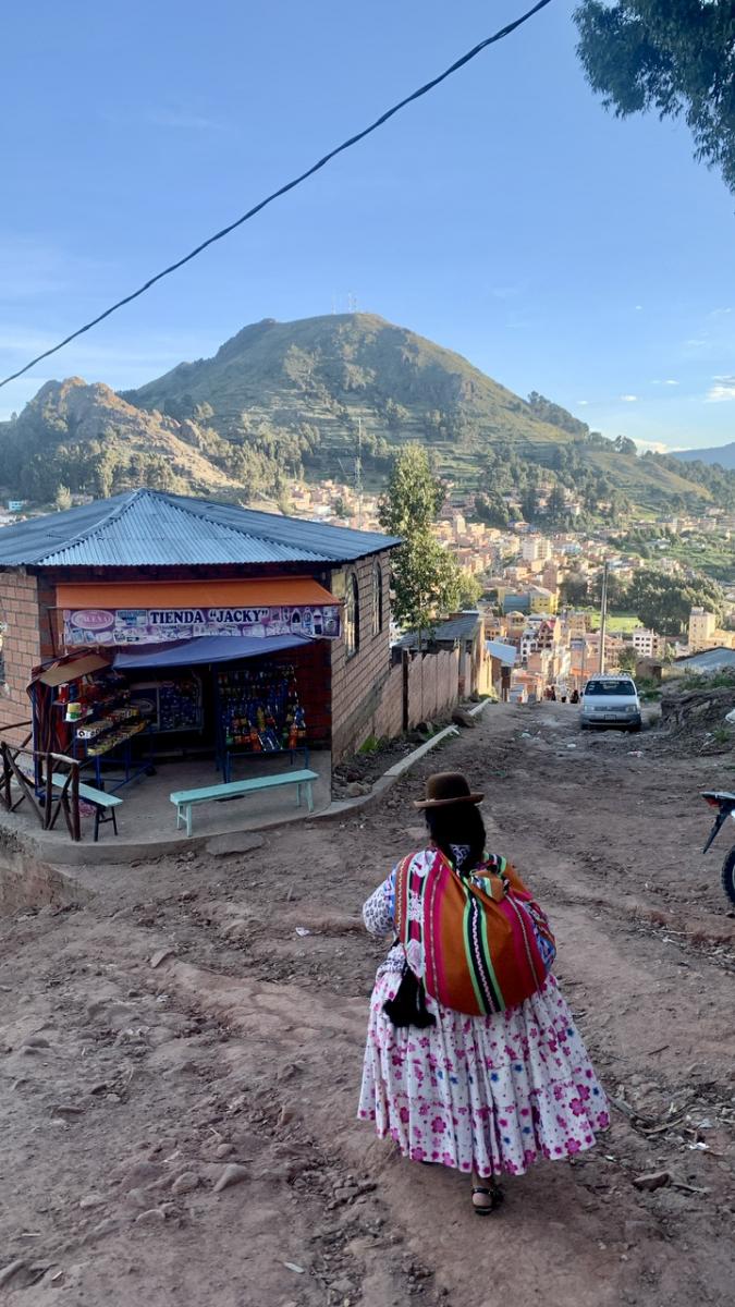 In vielerlei Hinsicht nimmt Bolivien als ärmstes Land des Kontinents eine besondere Stellung in unserer Reiseerfahrung ein. Allein schon das Bild der Bevölkerung unterscheidet sich maßgeblich von anderen Ländern. Bolivien hat von allen südamerikanischen Ländern den höchsten Anteil an indigener Bevölkerung, was sich vor allem an der traditionellen Kleidung der Frauen zeigt, die überall zu sehen ist: verschieden farbige, üppig ausgestellte Röcke, Strickjacken, bunte Umhängetücher statt Handtasche (auch Kinder werden darin getragen). Immer mit blickdichter Strumpfhose und Wollkniestrümpfen, dazu schwarze Halbschuhe oder Sandalen. Zum kompletten Dress gehören stets noch zwei lange geflochtene Zöpfe und ein Hut: Sommerhüte aus Stroh mit großer Krempe, einfarbige Filzhüte mit Schleife, schwarze Melonenhüte wie von Pan Tau und viele mehr. Ein bisschen erinnert mich die traditionelle Garderobe an San Cristobal in Mexiko, nur war sie dort nicht ganz so häufig zu sehen wie hier.