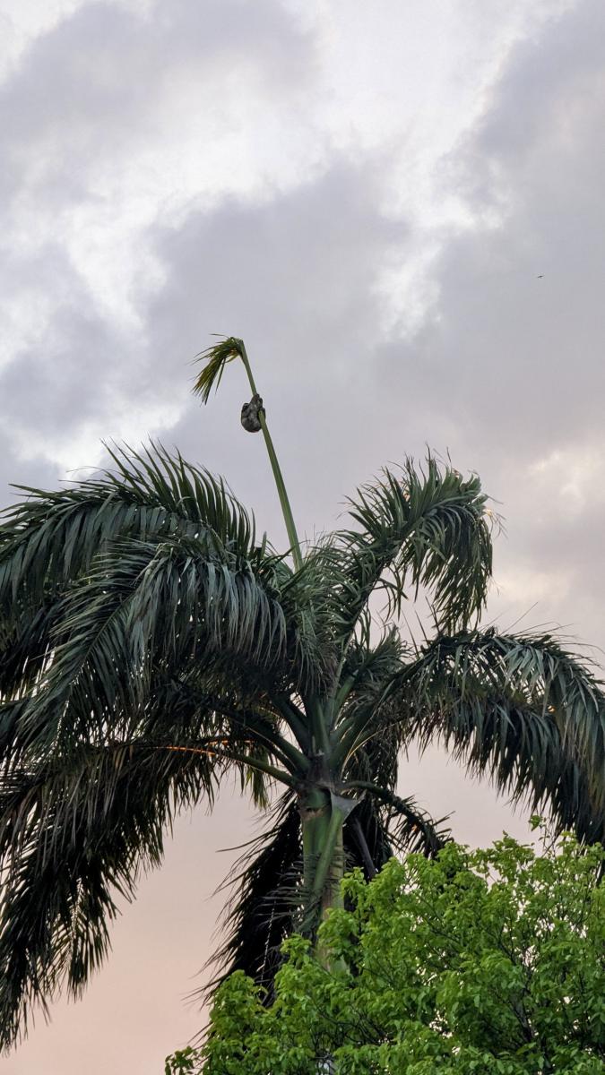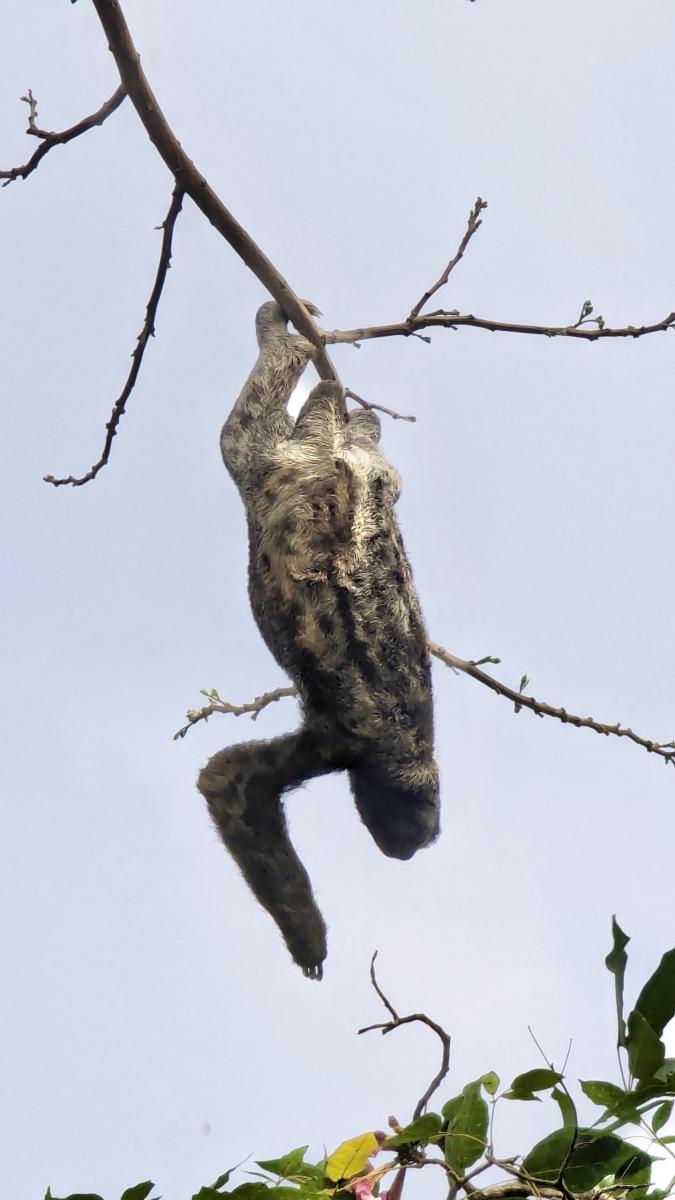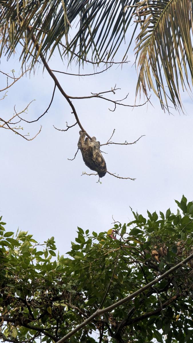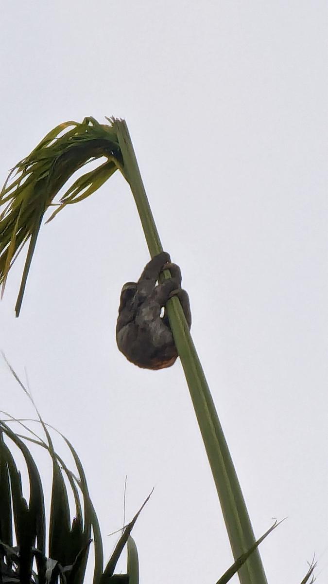 Schließlich bereitet die zunehmende Dunkelheit unserem Besuch irgendwann ein Ende. An ein Sattsehen der Tiere ist überhaupt nicht zu denken. Besonders lustig zum Abschluss ist auch noch ein Bild, wo ein Faultier ganz weit oben am höchsten Punkt einer Palme sitzt. „Das ist doch eine Plastiktüte im Wind, die da festhängt“, mein Udo. So sieht es auf ersten Blick auch aus. Aber nein, auch das ist ein Faultier. Das chillt eben da oben in hohen Lüften. Was denn sonst?! 😝