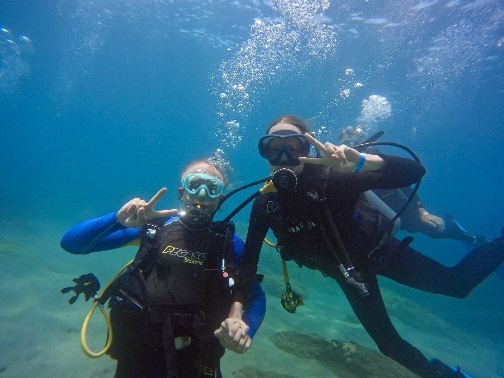 Er hält weiter meine Hand und wir kommen schon bald auf dem Sandboden an, wo wir kniend erstmal kurz verweilen. Ich kann die Wasseroberfläche gut sehen, die Sonne sorgt für beste Sicht. Sie scheint in Reichweite. Ich bin unter Wasser und es ist in Ordnung. Der Teacher macht ruhige Gesten zum Ein- und Ausatmen. Ab und zu zwinkert er mir zu und ich muss innerlich ein bisschen grinsen. Er zeigt mir die erste Übung: Einatmen, dann das Mundstück raus tun, Blasen ausatmen, Mundstück nehmen, einatmen. Geschafft! Weitere Übungen folgen. Er macht vor, ich mache nach. Sogar die, wo wir simulieren, dass ich das Mundstück im Wasser verliere und wiederfinden muss. Alles klappt! Der Wahnsinn. Er macht am Ende einen kleinen Applaus unter Wasser und ich habe tatsächlich die erste Prüfung bestanden. CHECK!!!
