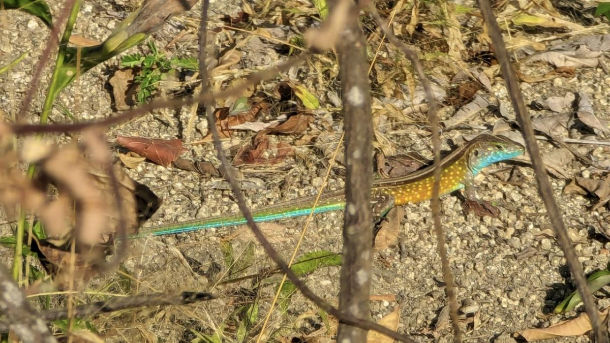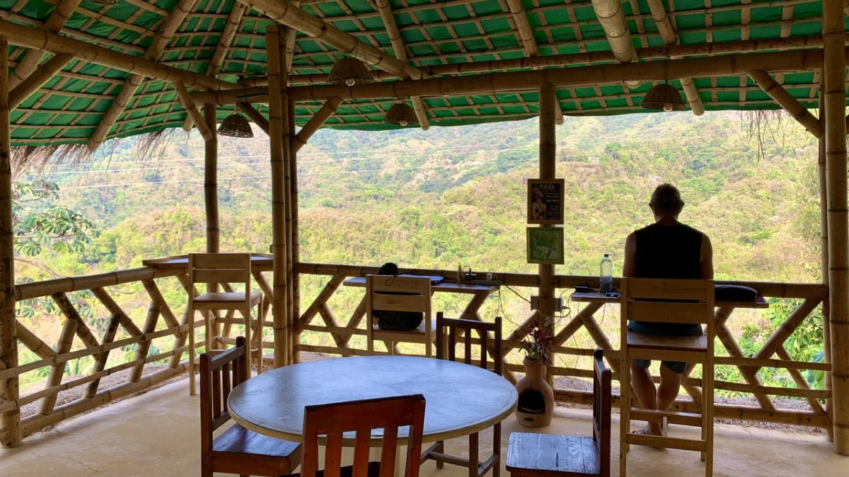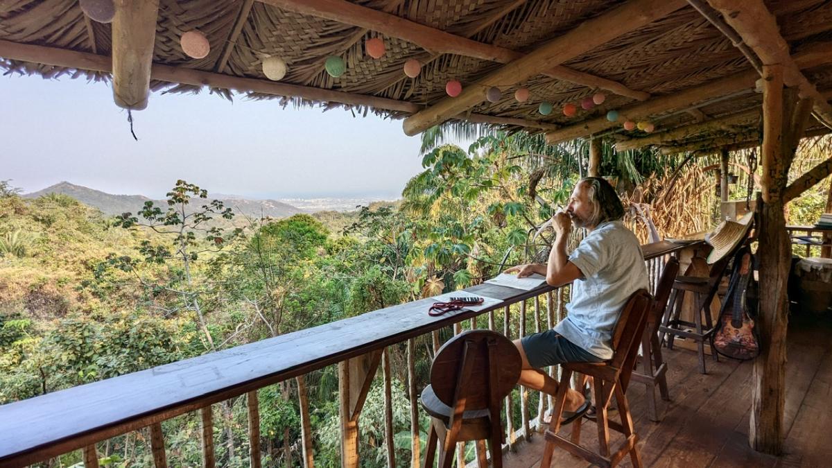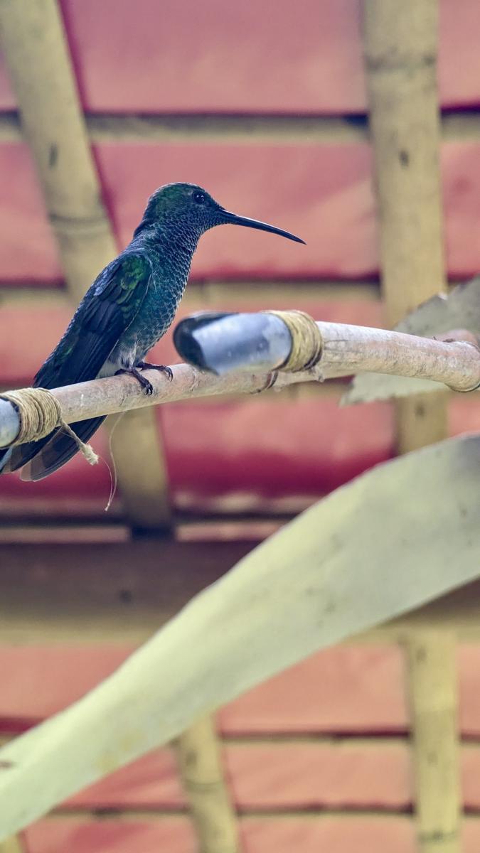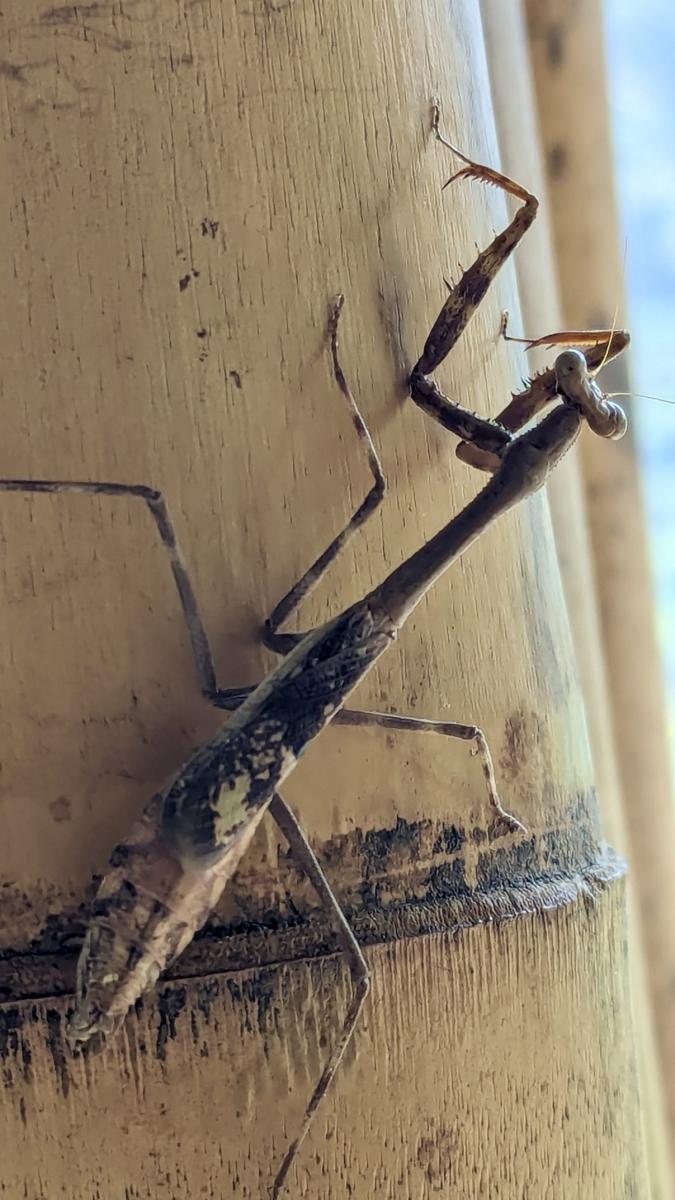 Ein herrlicher Ort zum Entspannen, Auftanken, Sortieren, nächste Schritte überlegen. Mit gelegentlichen Besuchern. Neben einem Kolibri, der ab und zu vorbei schaut, begeistert sich auch eine Mini-Gottesanbeterin besonders für Udos Outdoor-Arbeitsplatz.