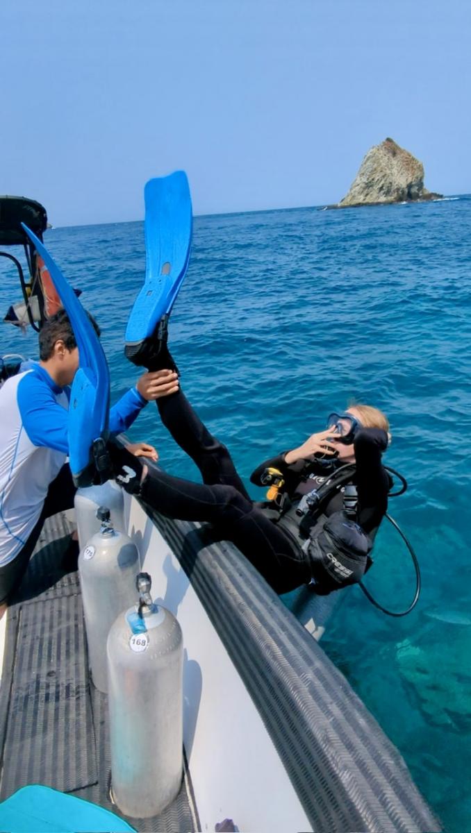 Die Lateinamerikanische Express-Variante also. Wir sind die einzigen Newbies im Boot. Alle anderen machen einen Fun Dive, also haben schon einen Tauchschein und machen hier ein paar Tauchgänge, um das marine Wildlife zu erkunden. Gleich zu Anfang habe ich schon die ersten Challenges, da sind wir noch nicht mal im Wasser. Der Neo ist mir am Hals viel zu eng. Der Gewichtsgurt drückt mir in den Magen. Am Bauch kann ich generell nichts haben, mir wird schon von einer engen Strumpfhosennaht schlecht. High Waist Jeans? Sieht super aus, geht leider gar nicht! Und jetzt dieser Monstergurt, der mich auch noch in die Tiefe ziehen soll 😱