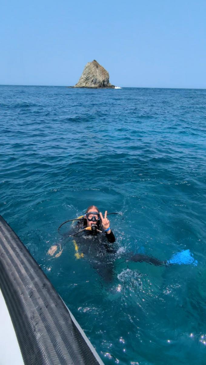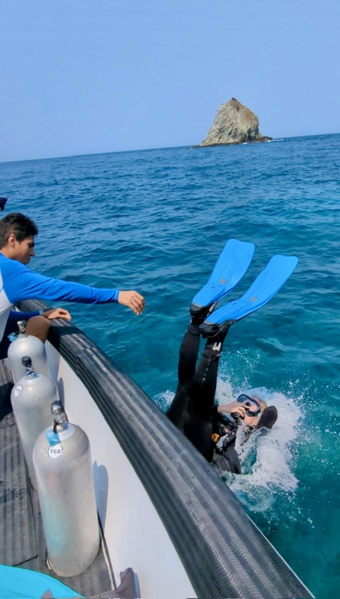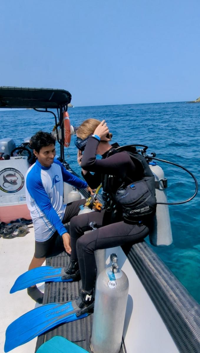 Wir fahren schließlich mit dem Boot weiter zum nächsten Spot und einem zweiten Tauchgang. „Beim zweiten Mal ist es leichter“, heißt es. Schon ganz souverän lasse ich mich dieses Mal von der Bootskante ins Wasser fallen. Kriege unter Wasser sogar eine lässige Drehung hin 😎 Siehe da, die Lernkurve ist schnell.