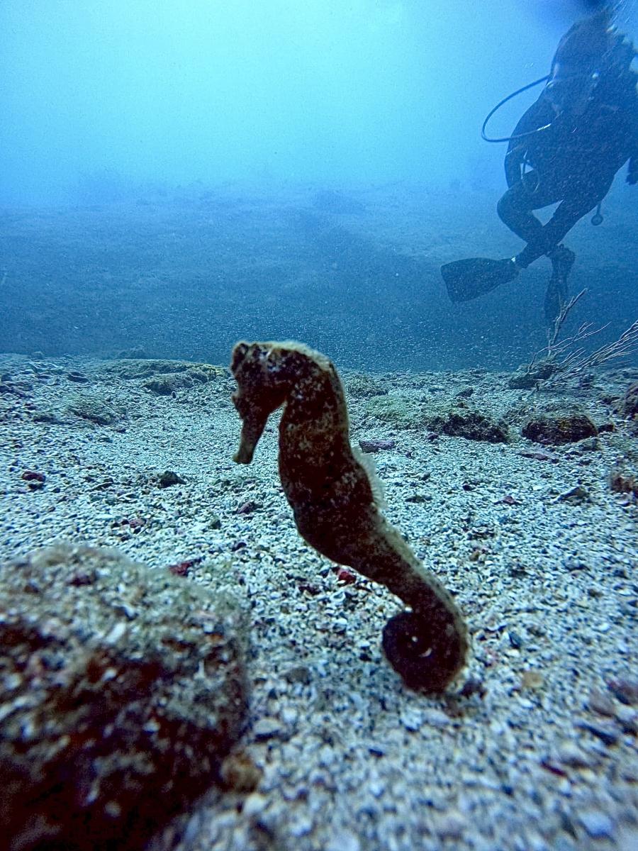Dieses Mal gibt es auch kein großes Rumgeplänkel, alle wissen, wie es läuft. An der Hand vom Teacher geht es runter, dann paar Meter gemeinsam, bis er auf Udo deutet und mich „fragt“, ob ich auch mit ihm tauchen würde. Klar, nicke ich. Und bewege mich in acht Metern Tiefe auf meinen Freund zu. Der hat gar nichts mitgekriegt und schwimmt schon weiter, bevor ich ihn erreiche. Ohne jemanden an der Hand finde ich mich also im Wasser wieder. Beim Tauchen. Und es geht! Keine Panik. Kein Drang, direkt wieder zur Oberfläche zu schwimmen. Ich muss nicht die Tiefste von allen sein, aber nach oben will ich auch noch nicht. Es ist zu besonders. Die Unterwasserwelt ist einfach magisch. Unglaublich, welches Leben hier existiert, von dem wir normalerweise nie etwas selber sehen oder mitbekommen. Bunte Fische und Korallen in allen möglichen Formen, sogar ein Seepferdchen!