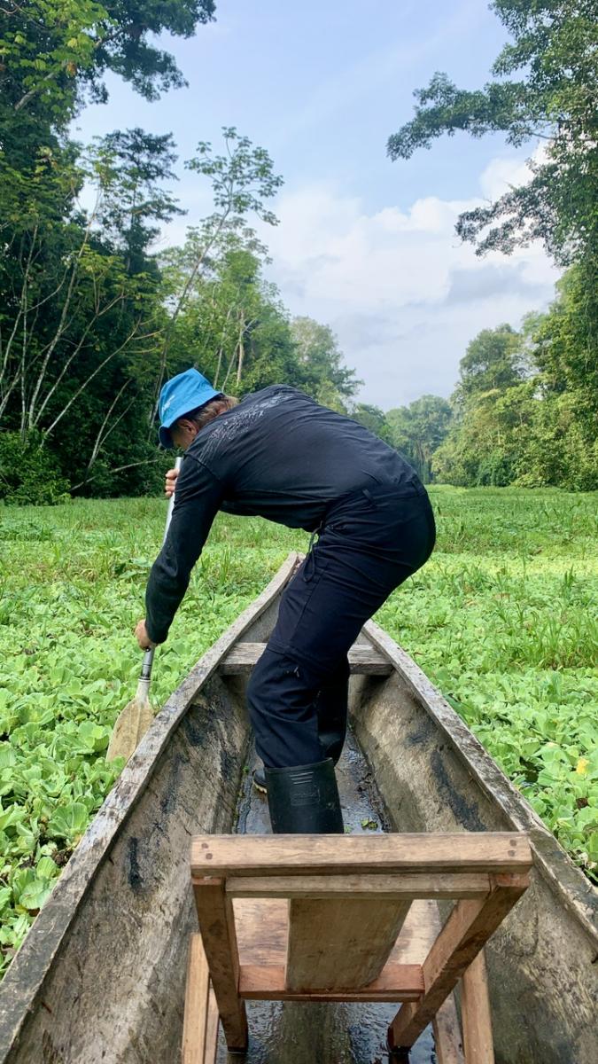 Dann kämpfen wir uns ein letztes Mal durch den tiefen Teppich an Flusspflanzen, die sich hartnäckig an unserem Boot halten und schlagen uns im wahrsten Sinne des Wortes durch den Dschungel, um an einen ganz besonderen Ort zu kommen. Ohne Elvios gekonnten Umgang mit der Machete würde hier für uns kein Durchkommen sein. Er muss im seichten Wasser sogar aussteigen und steht mit Gummistiefeln und Jeans bis zum Oberschenkel im Wasser, damit wir mit dem Kajak überhaupt voran kommen. Wie so oft gehört schon der Weg zum Ziel. Was für ein Abenteuer!