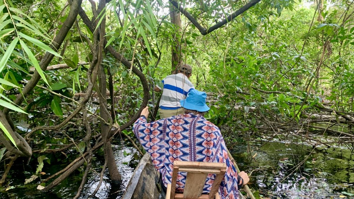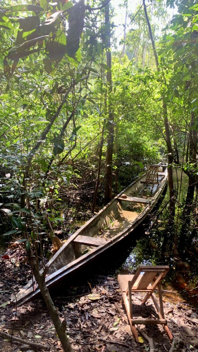 - Alles, was nicht zu Fuß geht, kommt und geht mit Booten. Wenn es regnet, wird eine große Plastikplane über alles und jeden im sonst offenen Kajak gelegt.