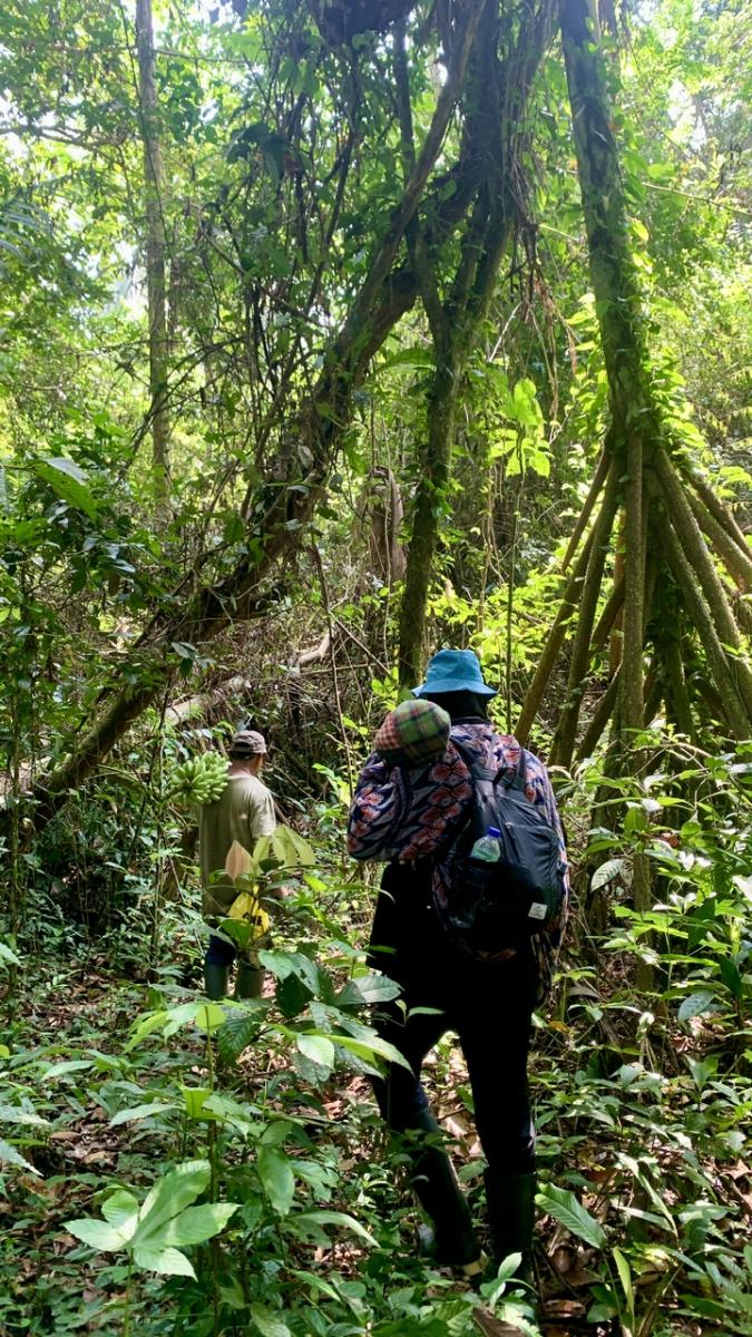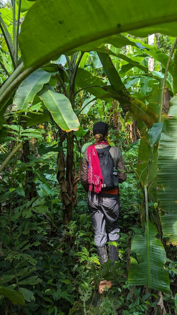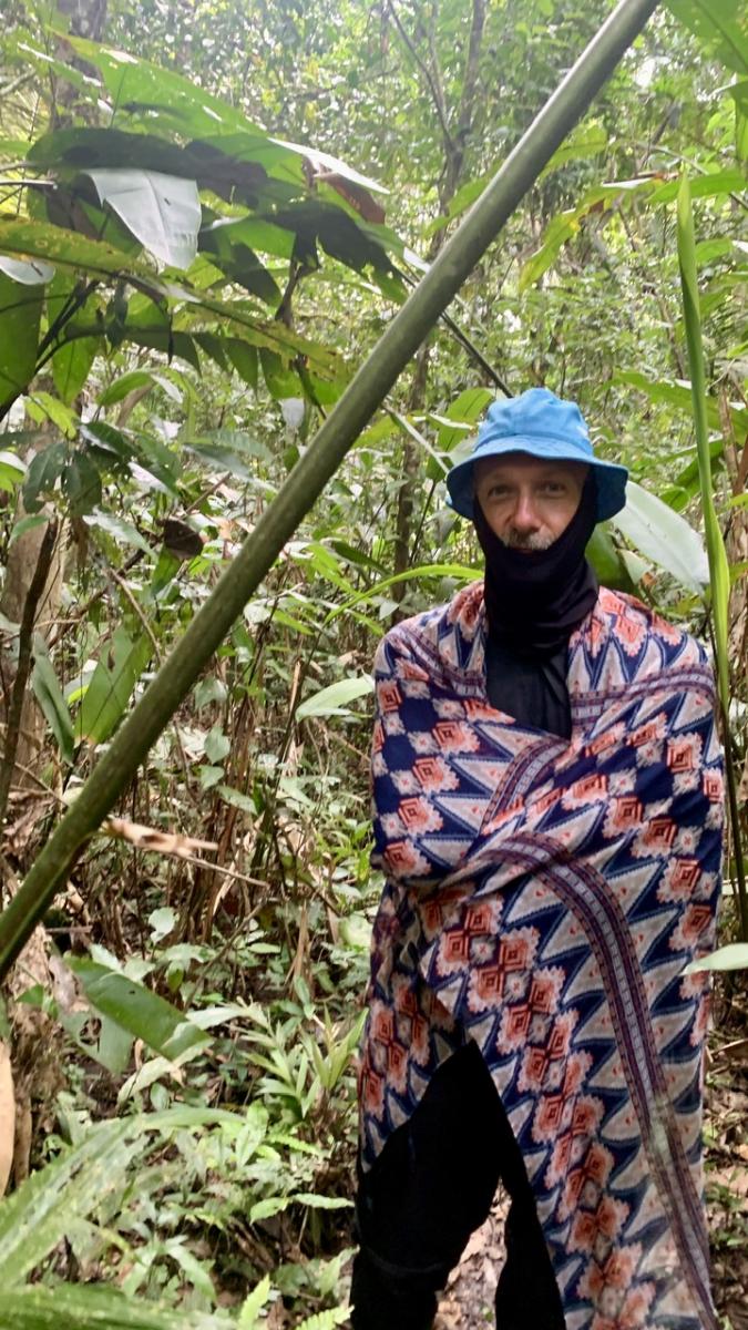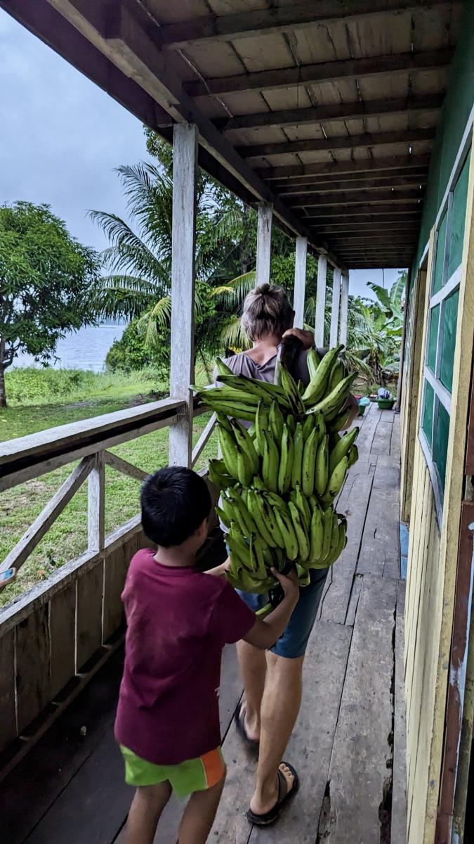 Es ist hier, unterwegs mit dem Vater Elvio, einmal mehr faszinierend für uns mitzuerleben, wie sehr die Umgebung, in der wir aufwachsen, unser ganzes Leben prägt. Während wir verhüllt wie die Imker und am Dauersprühen mit dem stärksten Insektenspray verzweifelt versuchen, von Moskitos & Co. nicht lebendig aufgefressen zu werden, wird Elvio weitgehend in Ruhe gelassen. Wo wir keinen Weg erkennen, macht uns Elvio mit zwei gezielten Machetehieben freie Bahn, und weiß, an welchem Baum es links oder rechts geht. Wo wir nichts anfassen, sammeln oder gar essen würden, erklärt uns Elvio, welche Pflanze für was gut ist, welche Frucht essbar ist, und wie man die riesige Bananenstaude erntet, die in unerreichbarer Höhe scheint: Kräftiger Hieb mit der Machete an den Stamm der Pflanze und zack liegt die ganze Staude transportbereit vor unseren Füßen. Easy. Wenn man weiß wie…