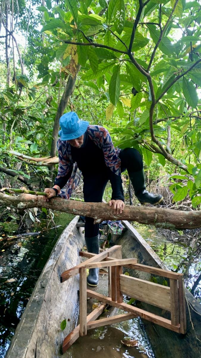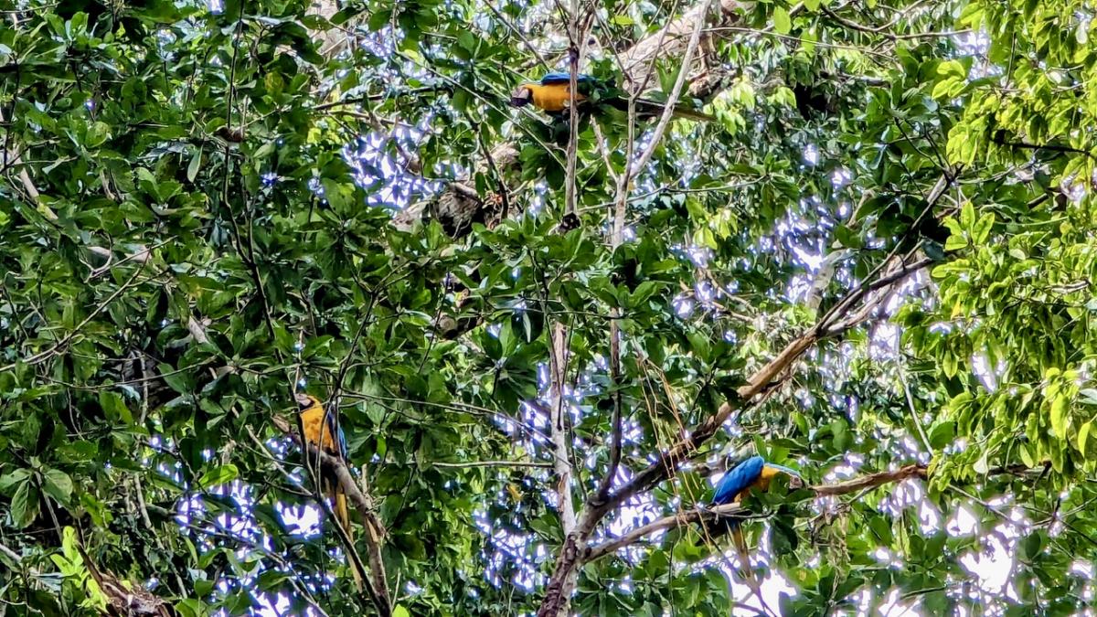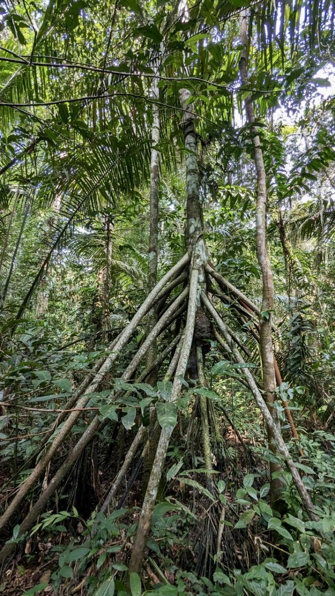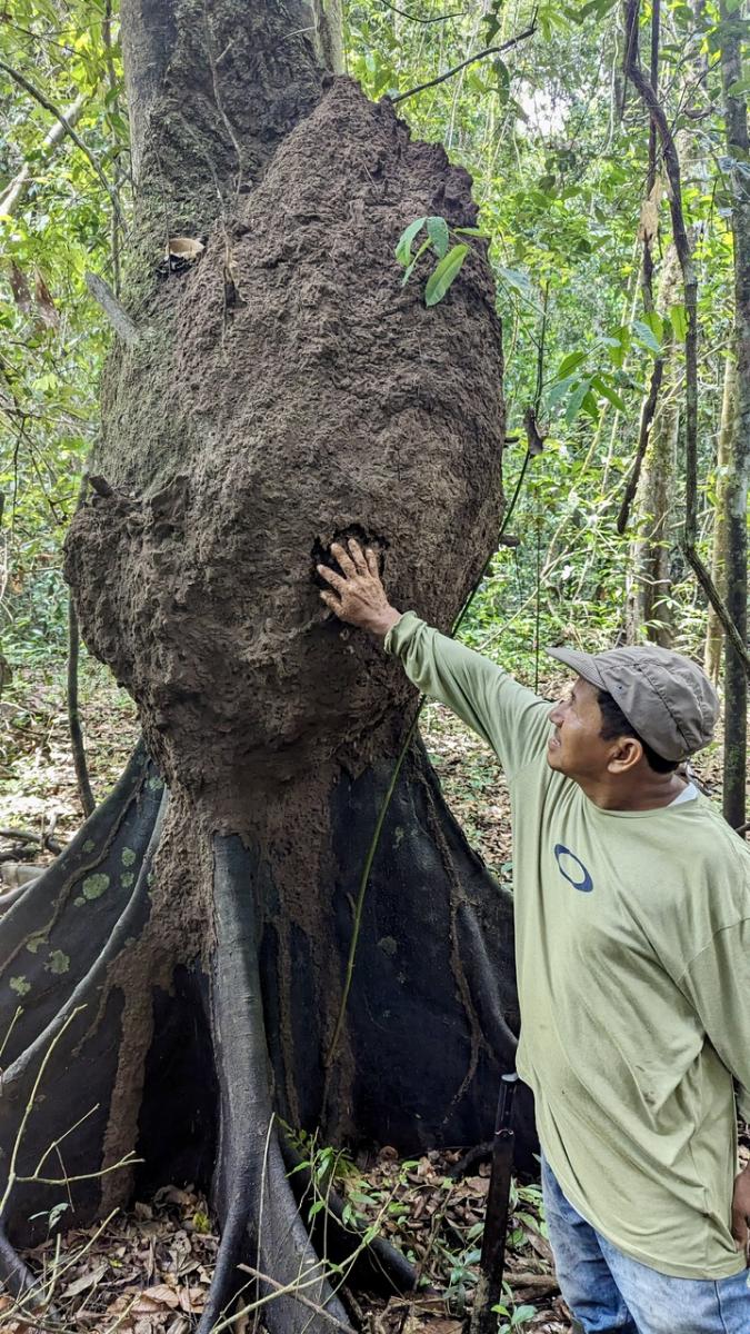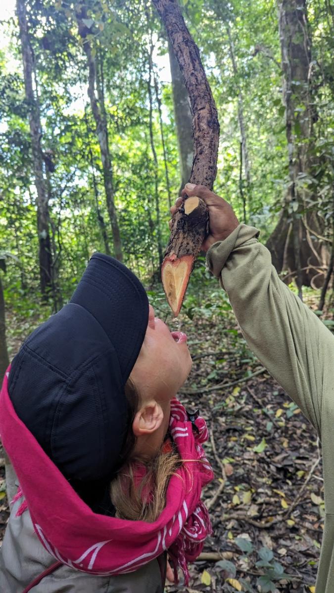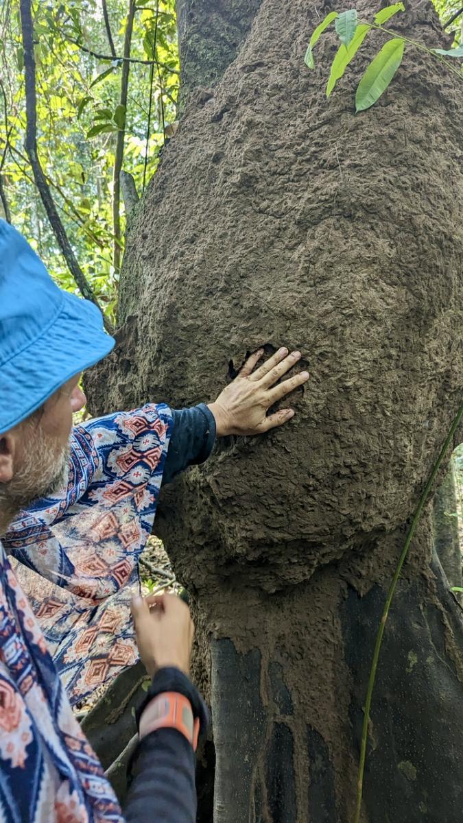 Angekommen empfängt uns ein Highlight nach dem anderen: Mehr als 15 gelb-blaue Aras sitzen über uns in den Baumwipfeln und liefern ein krähendes Konzert, als wir uns tiefer in den Wald bewegen. Wir sehen riesige Wurzelformationen, lernen wie und welche Bäume medizinisch eingesetzt werden (die reinste Naturapotheke!), trinken Baumwasser direkt aus dem Stamm, sammeln Früchte ein, die wir unterwegs finden, halten unsere Hände in ein Termitennest (ok, nur die Männer), schwingen uns wie Tarzan und Jane an Lianen hin und her und besichtigen schließlich Lupuna, die Mutter aller Bäume, über 500 Jahre alt und der reinste Wunderort.