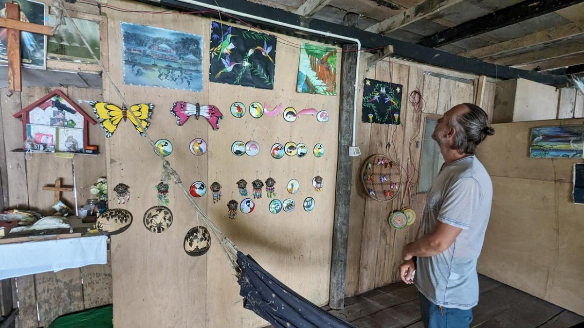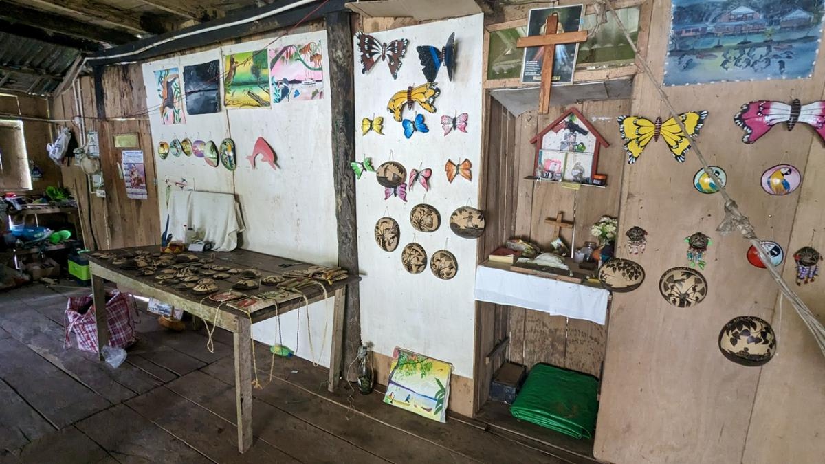 Besondere Kunst: Unser Nachbar am Grundstück nebenan, etwa 10 Gehminuten durchs Grüne entfernt, ist Künstler und stellt dekorative und nützliche Gegenstände aus Naturmaterial her: Taschen aus Palmenfasern, bemalte Dekoartikel aus Kürbisschalen und sogar aus Schuppen vom riesigen Amazonas Fisch Peiche. Es braucht einige Zeit, bis wir uns aus den spanischen Vokabeln einen Reim machen können, weil wir absolut nicht an Fischschuppen denken, als er uns einen ganzen Sack voll davon zeigt. Sie sehen für uns eher aus wie Fingernägel vom Dinosaurier…