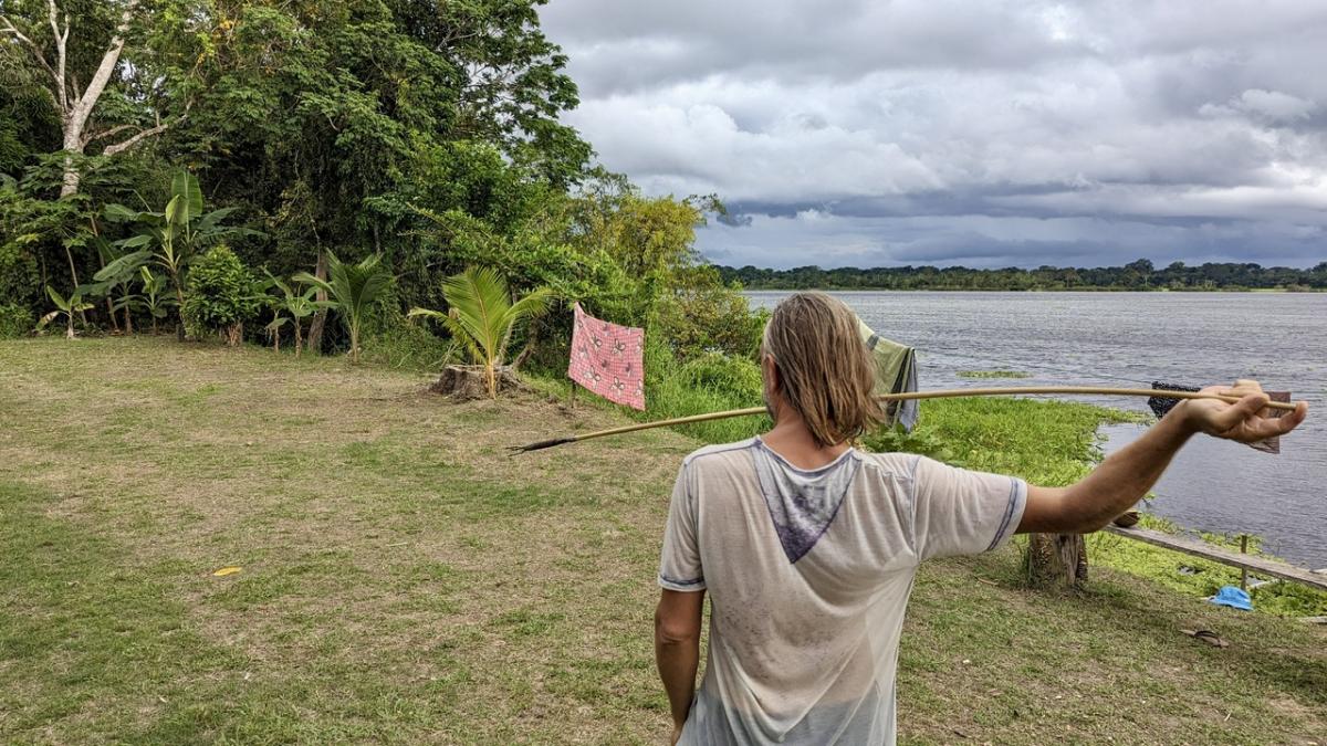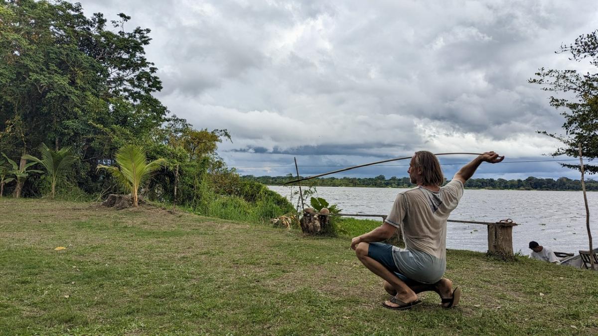 Besondere Fähigkeiten: Wir fragen Elvio danach, wie hier im Fluss Fische gefischt werden. Neben Fangnetzen ist Speerfischen hier die Technik der Wahl, wie wir lernen dürfen. Natürlich mit selbst gebauten Speeren. Die Technik interessiert uns und weil wir nicht „nur mal zum gucken“ Fische umbringen wollen, zeigt uns Elvio das Ganze an Land: Er legt ein Blatt in der Form eines Fisches einige Meter vor uns ins Gras und zeigt uns seine Kunst: JEDES MAL erwischt er das Blatt auf den Zentimeter genau da, wo er es treffen will. Aus dem Stand und im Sitzen, genau, wie er es vom Boot aus auch machen würde. Der Wahnsinn. Was für eine Fähigkeit! Wir probieren es selbst und Udo trifft immerhin in die Nähe vom Fisch. Meine kürzeste Distanz zum Zielobjekt ist ungefähr einen Meter…
