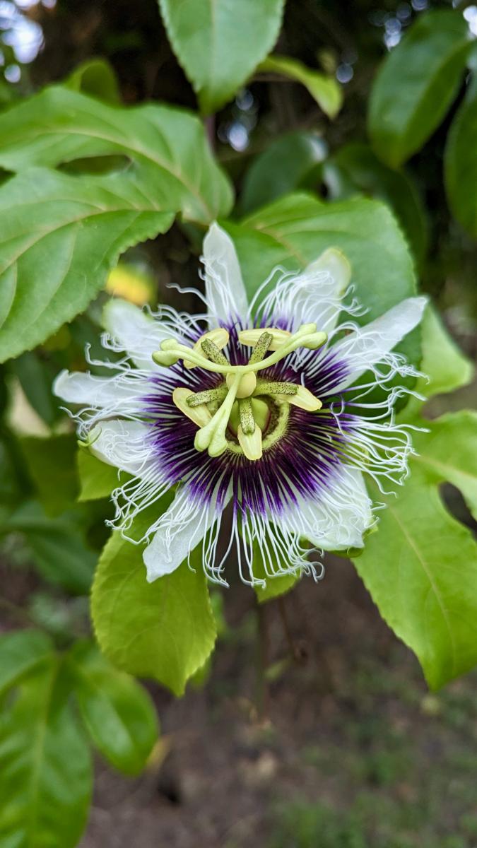 Besondere Nachbarn: Vormittags zeige ich Udo eine wunderschöne Blüte von einer Rankepflanze, die sich um die Palme neben dem Haus windet. Nach Sonnenuntergang zeigt uns Elvio an der selben Stelle eine riesige Vogelspinne, die in genau dieser Palme wohnt und jeden Tag abends halb sieben mal kurz vor ihrer Tür nach dem Rechten sieht.