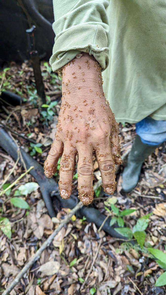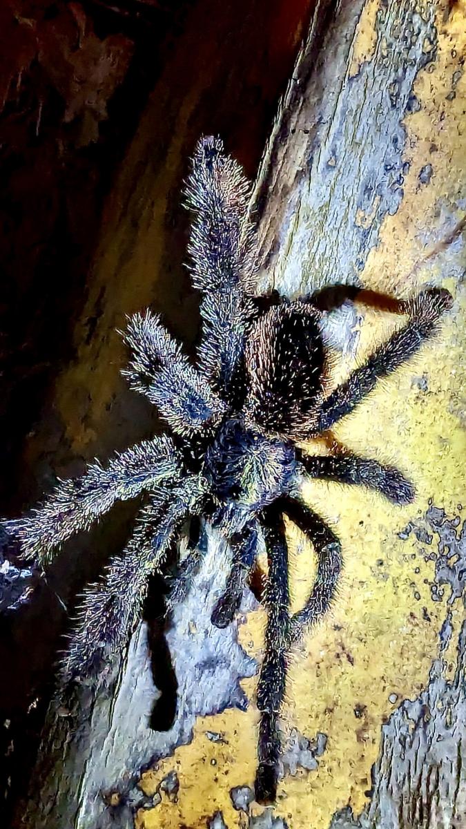 Besondere Krabbeltiere: Neben braunen Taranteln im Zimmer und schwarzen Vogelspinnen auf Kopfhöhe in den Palmen sehen wir hier und da immer wieder spannendes Krabbeliges. Getarnte Spinnen am Baum, die mit ihrem Hintergrund nahezu verschmelzen, kunterbunte Grashüpfer, alienartige Tausenfüßer und und und…