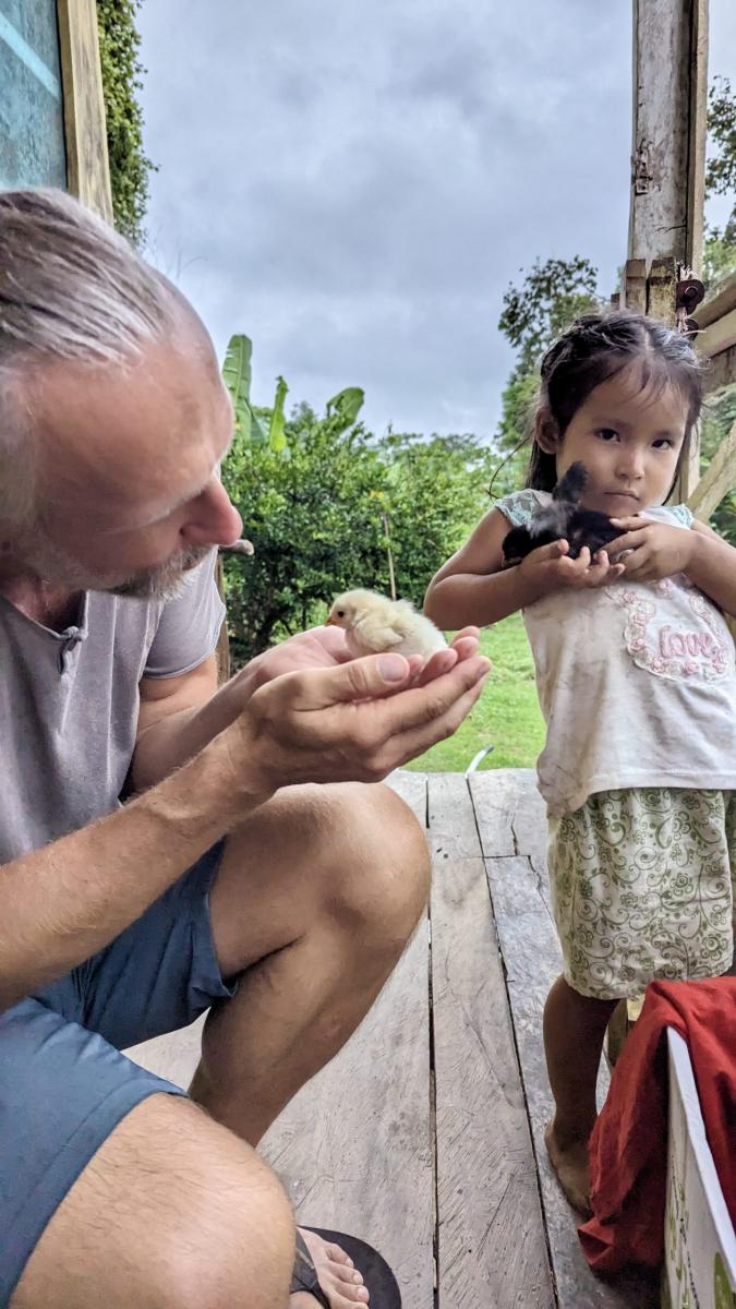 - Der “normale” Familieneinkauf in der nächst größeren Stadt, 10 Bootsstunden entfernt: Nach mehreren Tagen kommt die älteste Schwester mit einer Bananenstaude, einem Karton Küken und einer großen Tüte Klamotten für alle zurück