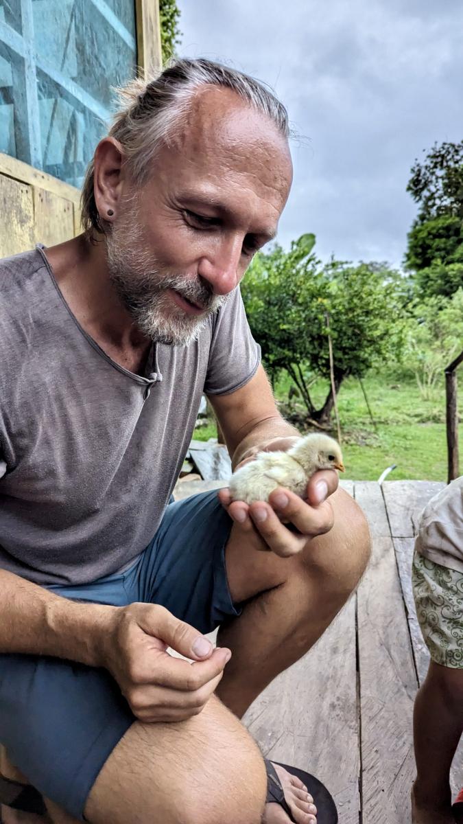 Früher konnte hier in der Gegend niemand schwimmen, weil der komplette Fluss voller Krokodile war. Dann kam in den 80ern eine brasilianische Firma, die mit Krokodilleder das große Geld gemacht hat. Seitdem gibt es in der Gegend nur noch wenige Krokodile und diese leben zurückgezogen von den Menschen. Auf meine Frage hin, warum kein Krokodil zum Steg kommt und einen auffrisst, während man sich im Flusswasser die Hände wäscht oder Geschirr spült, heißt es “Porque la gente los comen” – weil die Menschen die Krokodile essen. Und das hat sich unter den Tieren wohl hinreichend rumgesprochen, sodass das Flussufer in der Nähe von Siedlungen sicher ist, sogar zum Schwimmen (Udo liefert dafür täglich den Beweis 😂).