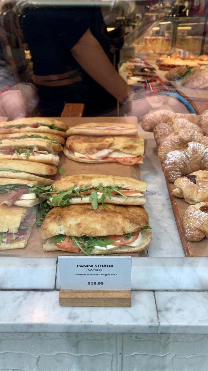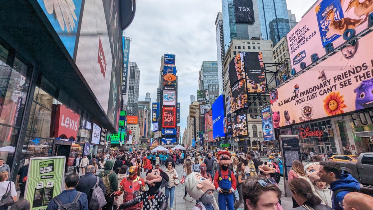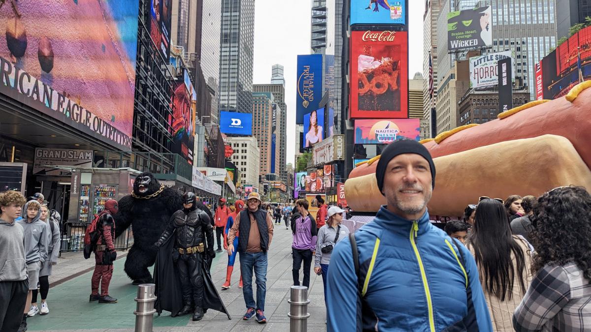 Gut eingepackt im Travel-Hippie-Style machen wir uns nochmal auf Richtung Times Square, schießen ein paar Fotos vor Ort (unter anderem von einem Tomate-Mozzarella-Panino für schlappe 16,95 USD), amüsieren uns über überdimensionierte HotDog Skulpturen, sowie Batman, Spiderman und King Kong, die uns lebensgroß entgegenkommen. Aus allen Richtungen flackern uns leuchtende Bilder von den riesigen Showtafeln entgegen. Menschen aus aller Welt treffen sich an diesem Ort, es sprechen kaum zwei Leute hintereinander die selbe Sprache.